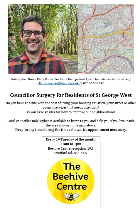 - cllr.rob.bryher@bristol.gov.uk – this email address is for all general enquiries, but particularly for St George West residents who need help with a problem or want to bring something to my attention (i.e. casework).